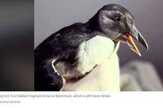 A lone Atlantic puffin was discovered on October 5th on a residential street next to Lake Pearl in Wrentham, Massachusetts.