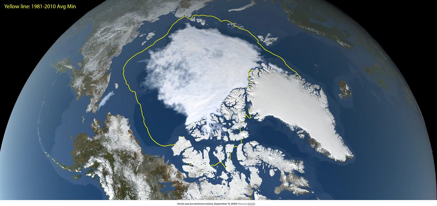 In the Arctic, sea ice does not melt like the spring thaw of ice on a lake that starts along the shore and leaves a patch of ice in the middle. Instead, the melt begins against the Greenland Sea and not the land. The West Spitsbergen Current transports more warm Atlantic Water into the Arctic Ocean. NASA imagery of the 2024 sea ice melt shows it following the ocean currents’ counterclockwise gyre until the thickest ice remains at the current’s farthest reach along Canada and Greenland’s shore.