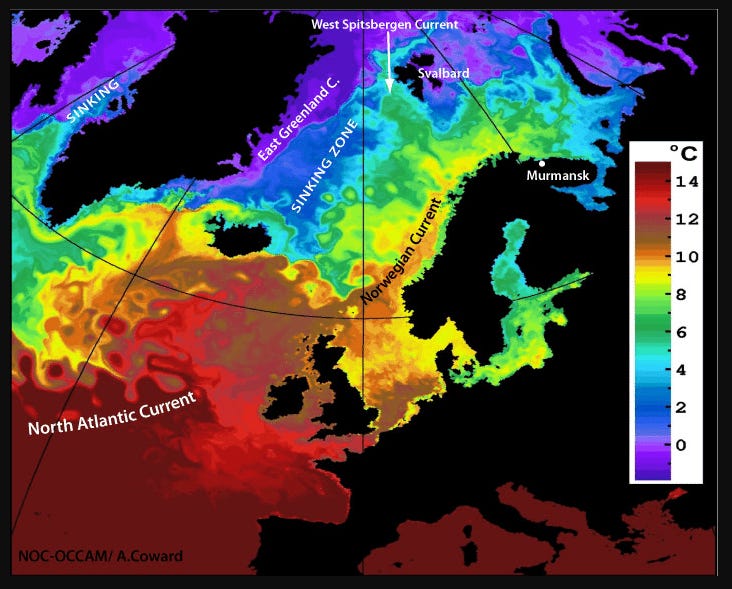 Southbound seawater from the Arctic Ocean, powered by differing water densities of thermohaline circulation, flows into the Greenland Sea. Beyond is the Denmark Strait between Iceland and Greenland. This is the gateway to the Atlantic Ocean, where the current narrows into a “jet” of higher energy flow, the place that the Woods Hole Oceanographic Institute calls the “superhighway.”